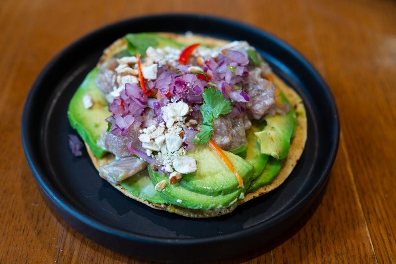 We started with a tostada acebichada (it rhymes), a simple fusion of Mexican and Peruvian cuisine. The appetizer featured a simple ceviche and slices of avocado on top of a fried corn tortilla. The contrast between the texture of the ceviche and the crunch of the tortilla made this a fun dish to start with.