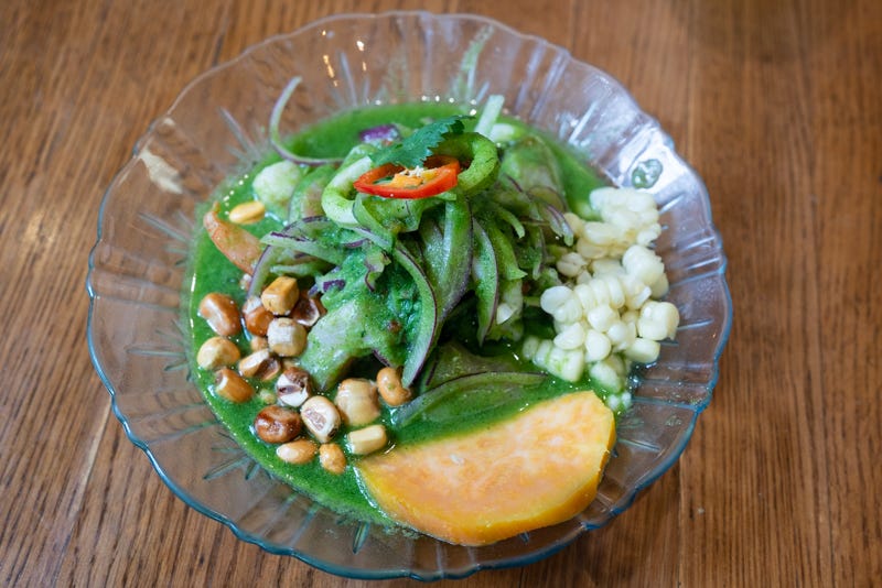 Next, we knew we needed to dive deeper into the ceviche. Our eyes immediately gravitated to the “Lima CDMX” ceviche. The ceviche featured the kind of seafood you’d expect in a ceviche mixto-fish, shrimp, and squid. The Chile Serrano gives the dish a decidedly Mexican flavor. Chile peppers are a central part of Peruvian and Mexican cuisine, though Mexican peppers tend to be spicier. If the green in the leche de tigre was all serrano, that would’ve probably been overkill. Luckily, the leche de tigre was tempered by a good dose of cilantro.